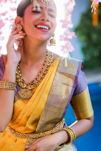 So go forth, conquer dance floors, and leave 'em speechless in your wake. This is your day, your saree, your chance to rewrite the rules of elegance with a healthy dose of awesomeness. Remember, South Indian bride, with this Kanjivaram...