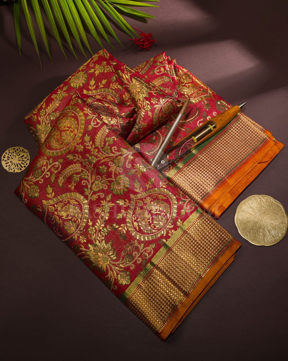 Where tradition meets radiant splendor, this bright red tissue shimmer Kanjivaram makes a striking statement. The luminous body is adorned with exquisite meenakari mayil buttas and intricately woven floral jaals that showcase masterful craftsmanship. Each motif gleams beautifully against the vibrant red backdrop, creating a rich tapestry of color and texture. The light green shimmer border introduces a refreshing contrast that enhances its regal allure. Ideal for weddings and festive celebrations, this saree is a timeless expression of grace and grandeur.