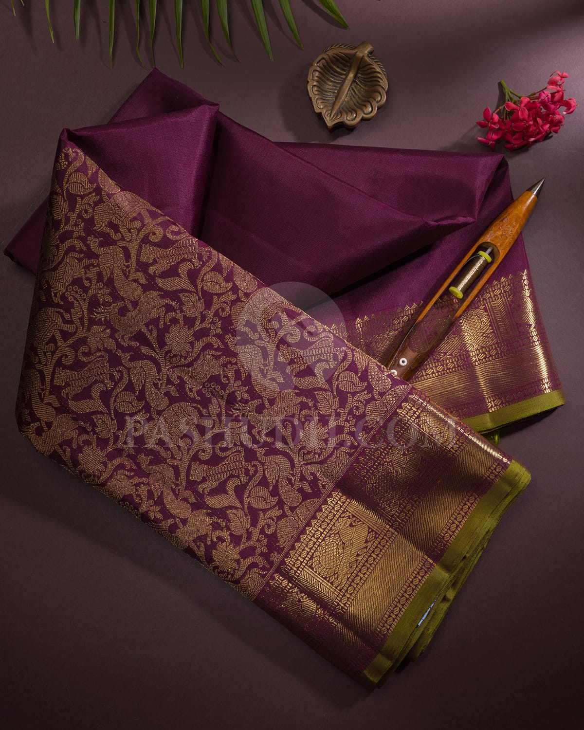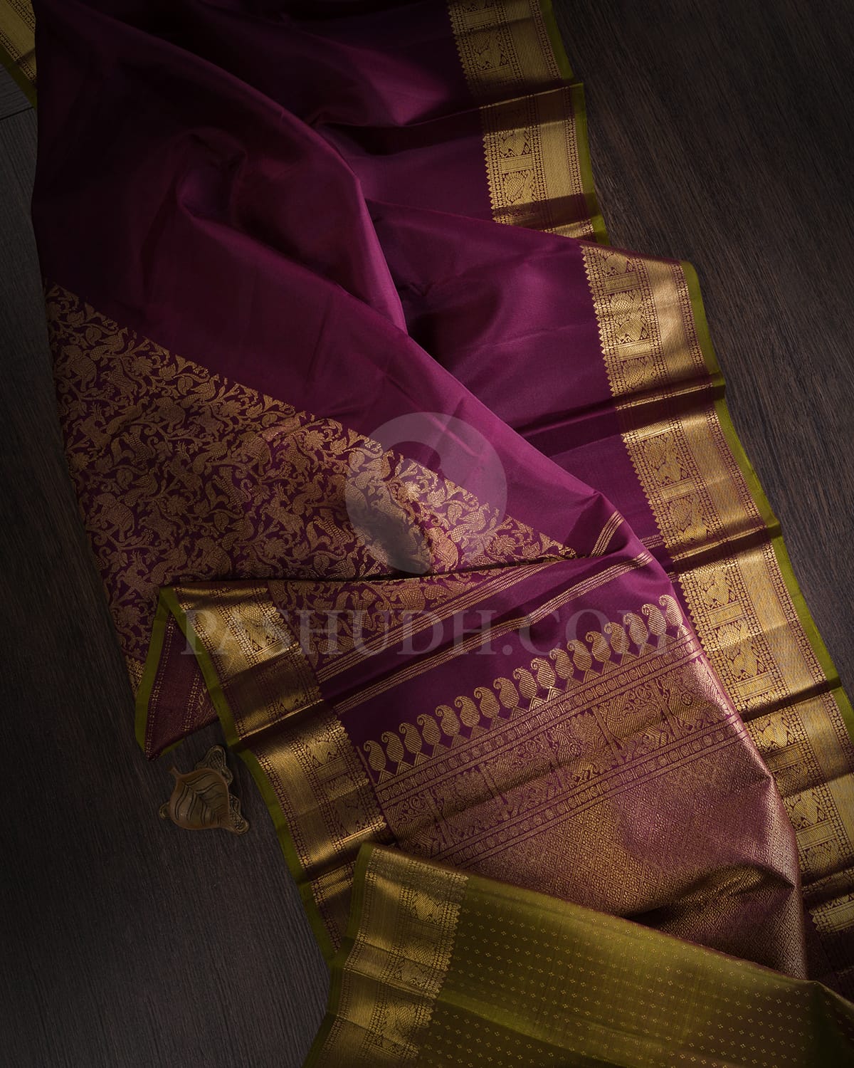Aubergine With Dual Shaded Olive Green Pure Zari Kanjivaram Silk Saree-SP296