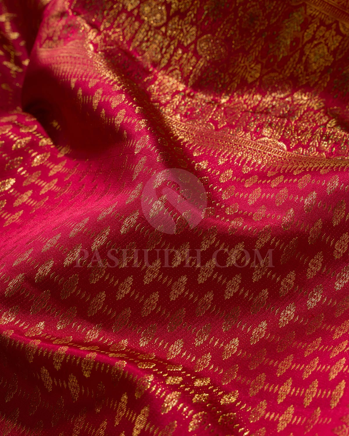 Fit for a queen, this exquisite Kanjivaram silk saree is truly a masterpiece. The Red body is sure to captivate, adorned with stunning butta stripes woven in rich gold zari. The matching one-side-large border draws attention with its intricate detailing on floral veins and star motifs, highlighted with gold zari and subtle green accents. The rich gold zari diagonal stripes in the pallu enhance the drama and opulent shimmer across the weave. Paired with a plain Red silk blouse with matching border, this gorgeous saree is truly the best of the best, perfect for weddings, festive occasions, and grand celebrations.