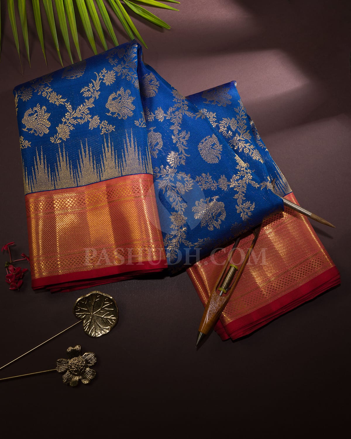 Radiating regal charm, this bridal Kanjivaram silk saree features a majestic royal blue body adorned with intricate gold zari peacock motifs. The diagonally dossed floral jaals across the body add depth and elegance, creating a rich, textured effect. A contrasting pink and gold zari temple border frames the drape, enhancing its traditional grandeur and bridal opulence. Perfect for weddings and auspicious occasions, this saree is a stunning testament to heritage craftsmanship and timeless sophistication.