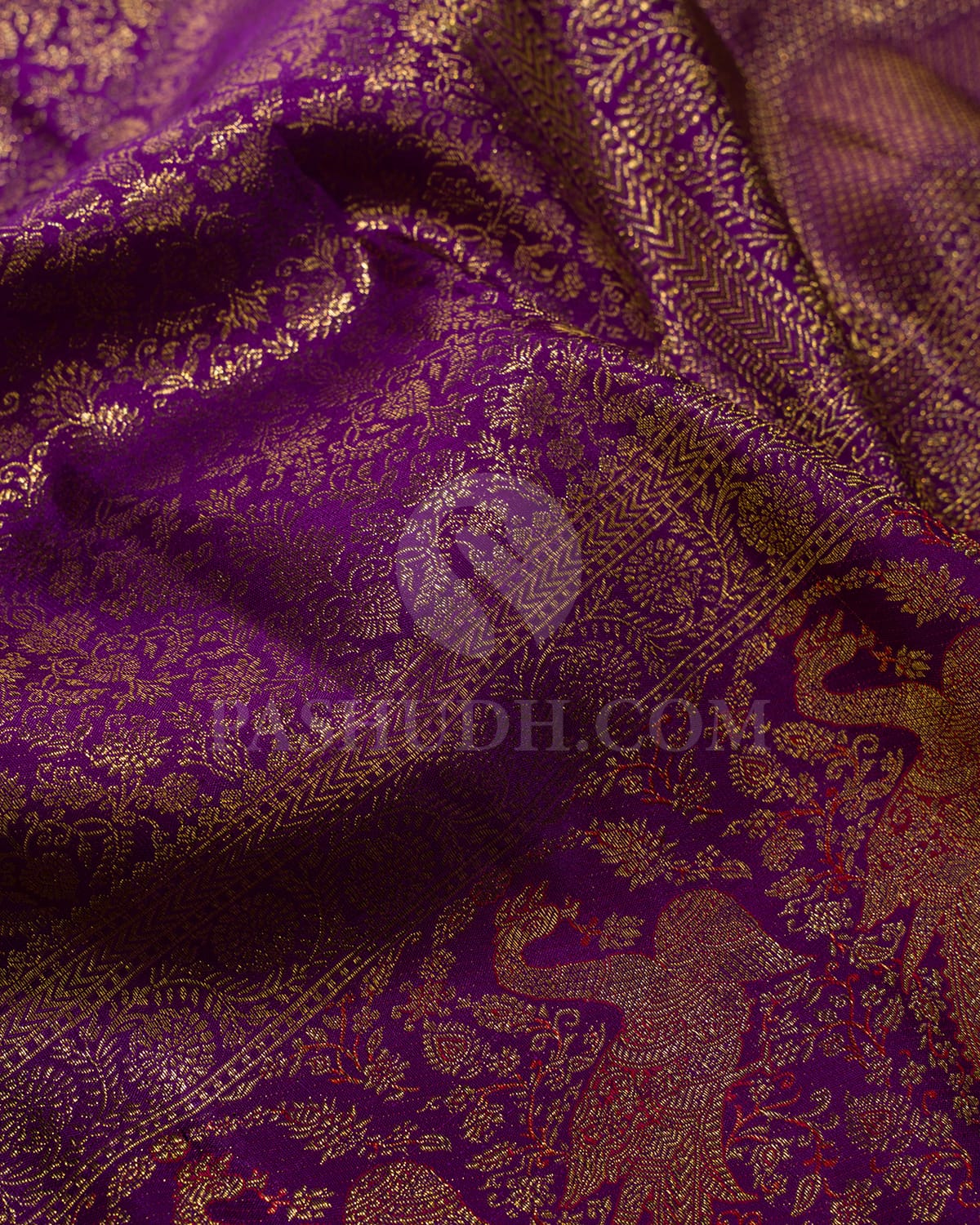 A regal expression of bridal splendor, this violet kanjivaram silk saree captivates with its rich gold zari brocade body, exuding opulence and timeless grandeur. The border is adorned with unique bird motifs woven in gold zari, adding a touch of distinctive artistry and heritage charm. Perfect for weddings and grand celebrations, this saree beautifully blends traditional craftsmanship with a striking, sophisticated allure.