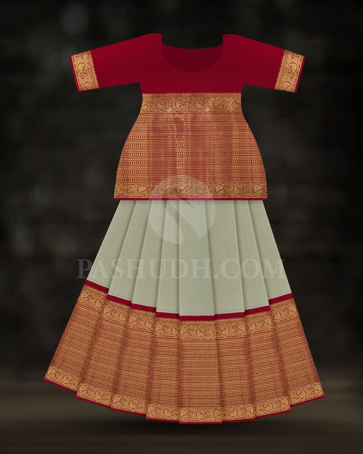 Mild Pista Green Pattu Paavadai Set With Red Border-PA11