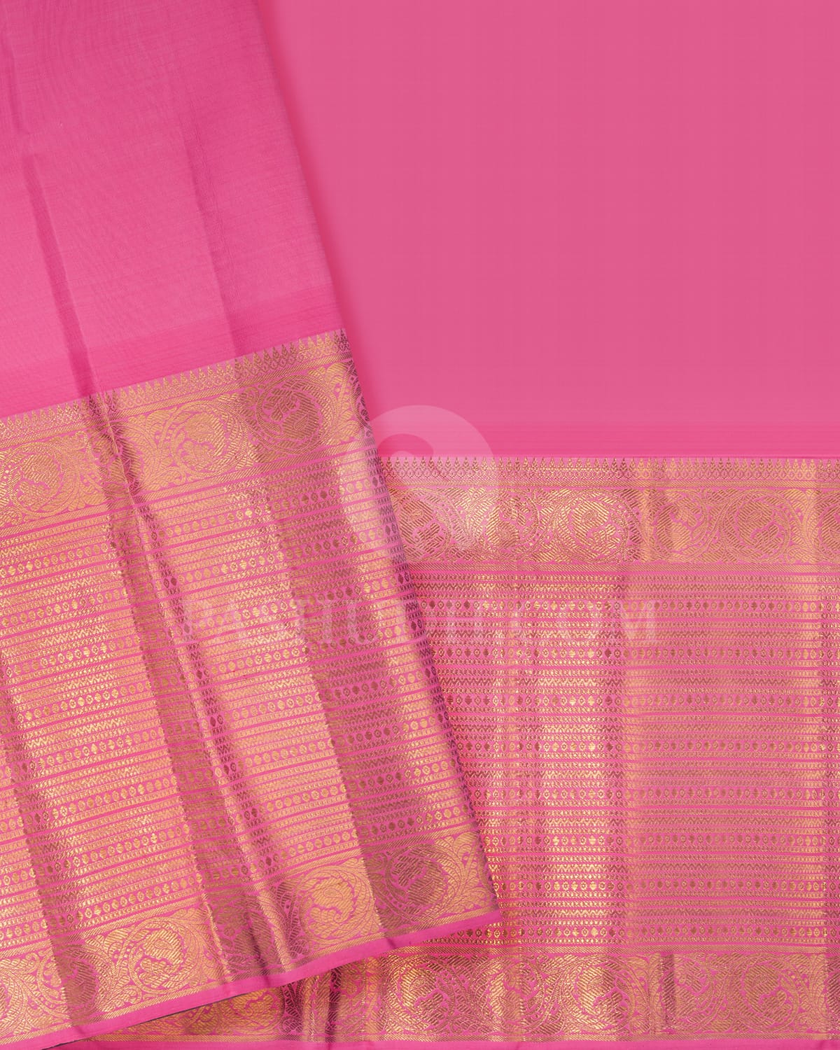 A striking turquoise blue pattu paavadai, glowing with festive charm, accentuated by a broad pink border woven in rich traditional gold zari. Paired with a matching pink sattai, this ensemble brings together bold contrast and timeless elegance. Its a perfect outfit for celebrations and cultural occasions.
