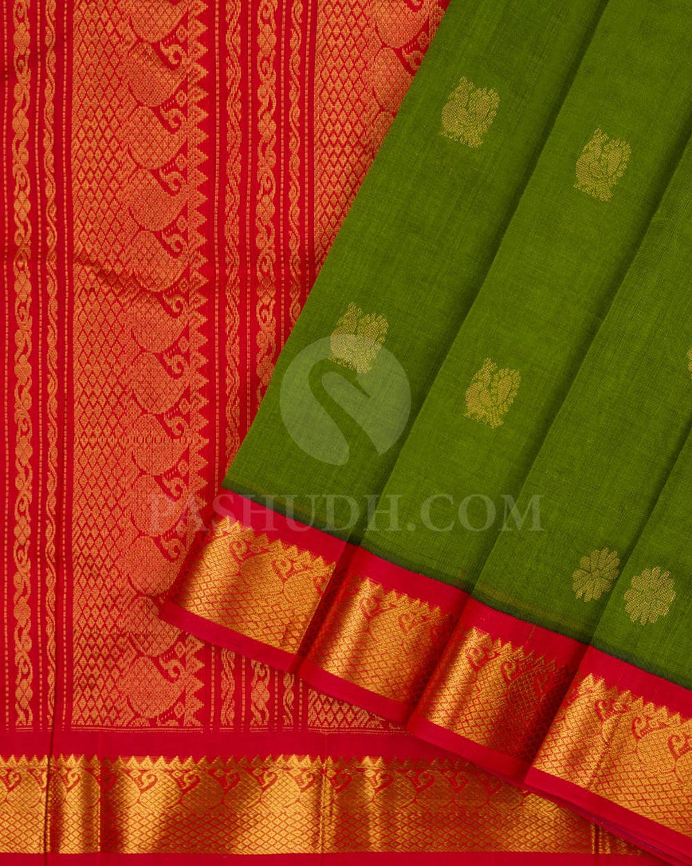 Olive Green and Crimson Red Kanjivaram Silk Cotton Saree - RC9