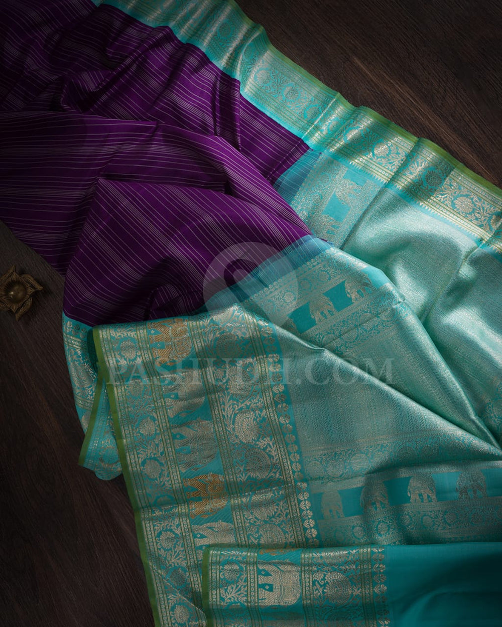 Look Majestic in this Beautiful Kanjivaram Silk Saree from Pashudh. While Pretty Stripes run through the attractive Purple body, the contrasting Sky Blue border with green selvedge features majestic elephant motifs along with classic kodi visiri pattern, woven with silver gold zari. The grand Sky Blue border looks opulent with stunning gold silver zari patterned stripes, capturing traditional opulence. Paired with a plain Sky Blue silk blouse with matching border, this Gorgeous Weave is a wonderful choice for any grand event.