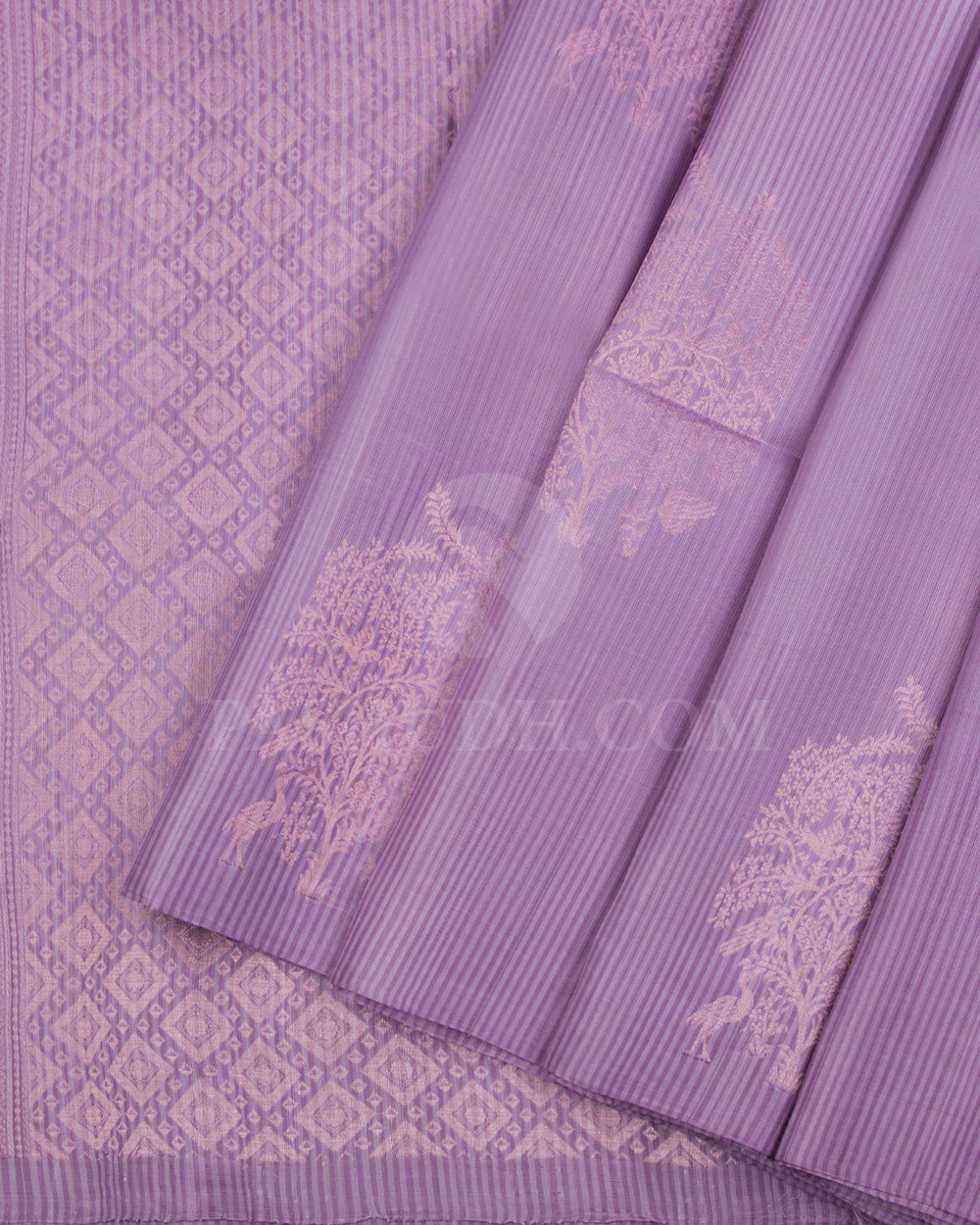 Look Graceful in this Delightful Soft Silk Saree from Pashudh. Featuring a flattering Lavender Coloured, Borderless Striped Body with Gorgeous Floral Bouquet Motifs woven with Rose Gold Zari, this Pleasing Weave showcases an array of Stunning Diamond Patterns woven with Rose Gold Zari on the Rich Lavender Pallu. Paired with a Plain Striped Lavender Blouse, this Trending Weave is a wonderful addition to your wardrobe.