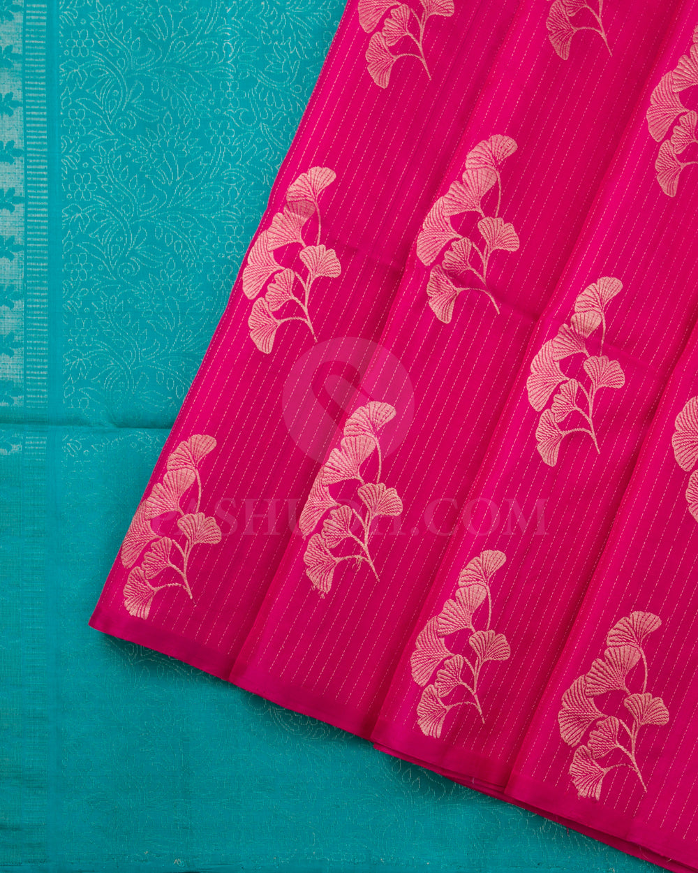 Turn Heads in this Vibrant Soft Silk Saree featuring a Gorgeous Rani Pink Borderless Body embellished with fine Mild Gold Zari Stripes with Attractive Flower Buttas. The Contrasting Sky Blue Pallu looks ornate with Beautiful Mild Gold Zari Patterns exuding Sophistication. Accompanied by a Plain Sky Blue Blouse, this Lovely Weave will be a wonderful addition to your wardrobe.