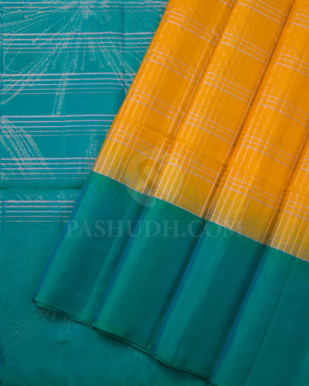 A Vibrant Choice for Joyous Events, this Stunning Soft Silk Saree from Pashudh is a Wonderful Addition to your Wardrobe. The Lovely Yellow Body is embellished with fine Silver and Mild Gold Zari Checks, exuding a Classic look while the contrasting Turquoise Blue Border and Turquoise Blue Pallu with Silver Stripes truly Exude an air of Elegance. Paired with a Striped Turquoise Blue Blouse, this Beautiful Weave is a Head Turner.