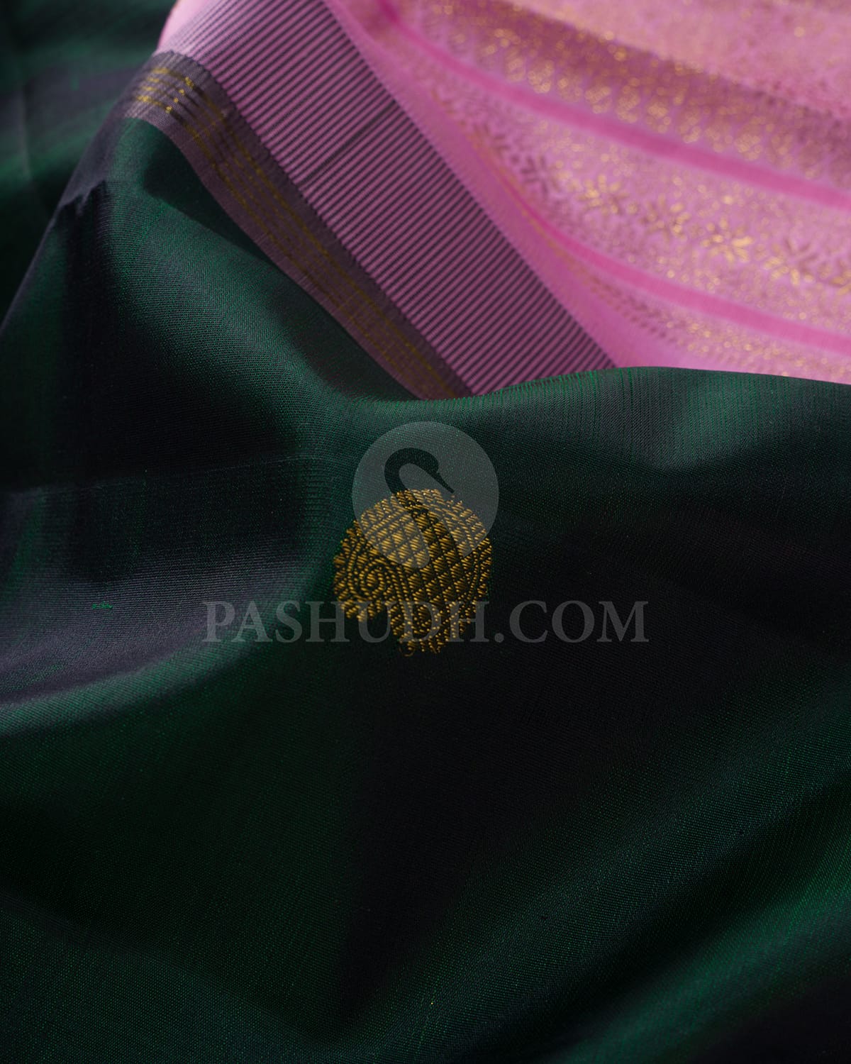Graceful and steeped in tradition, this saree features a rich dark green body adorned with exquisite gold zari mango and rudhraksh buttas that lend a sacred charm and timeless elegance. The intricate motifs shimmer beautifully against the deep green base, creating a look of regal sophistication. Complementing the body is a lilac border woven with lustrous gold zari, adding a soft yet striking contrast. Perfect for festive and traditional occasions, this saree embodies heritage, richness, and refined grandeur in every drape.