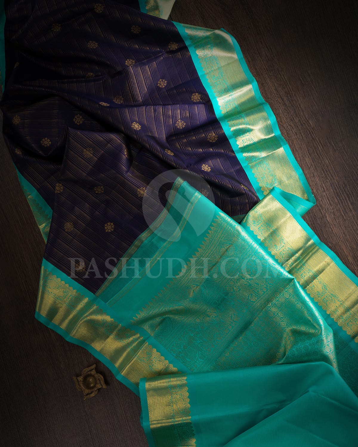 A mesmerizing weave of tradition and allure, this korvai Kanjivaram saree in navy blue and turquoise blue is pure elegance. The body is adorned with gold zari bhelthari lines that shimmer with every movement. The contrast of hues brings depth and sophistication, while the korvai craftsmanship reflects timeless artistry. A perfect pick for those who love heritage with a modern touch.