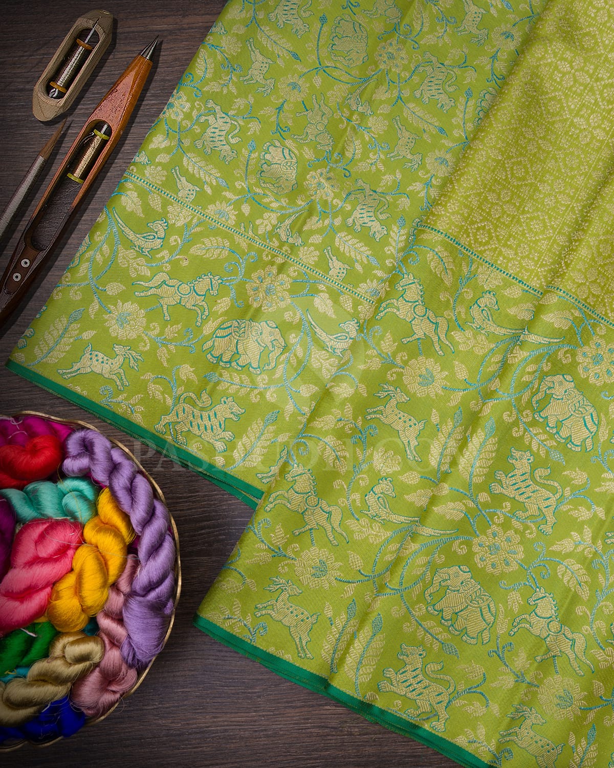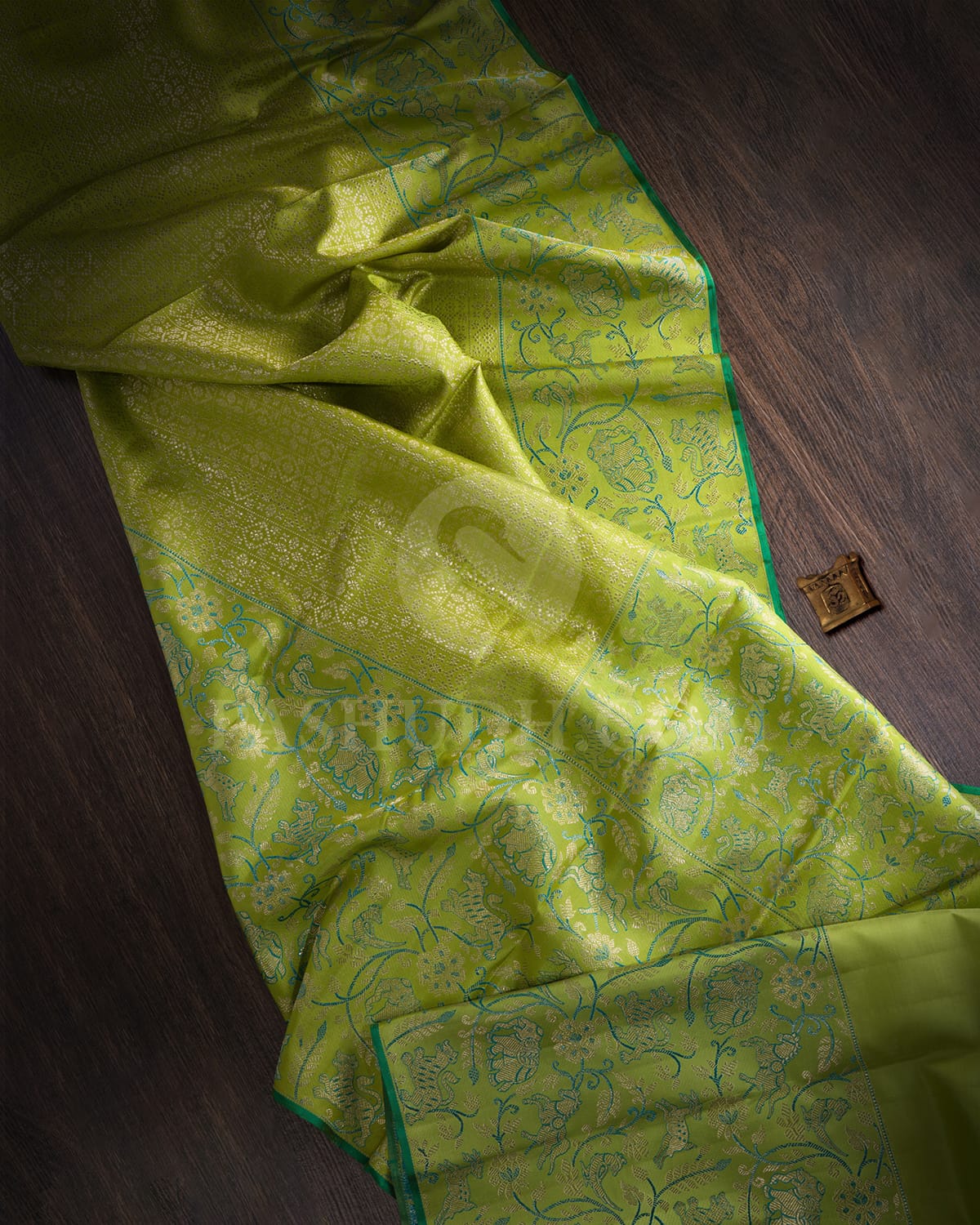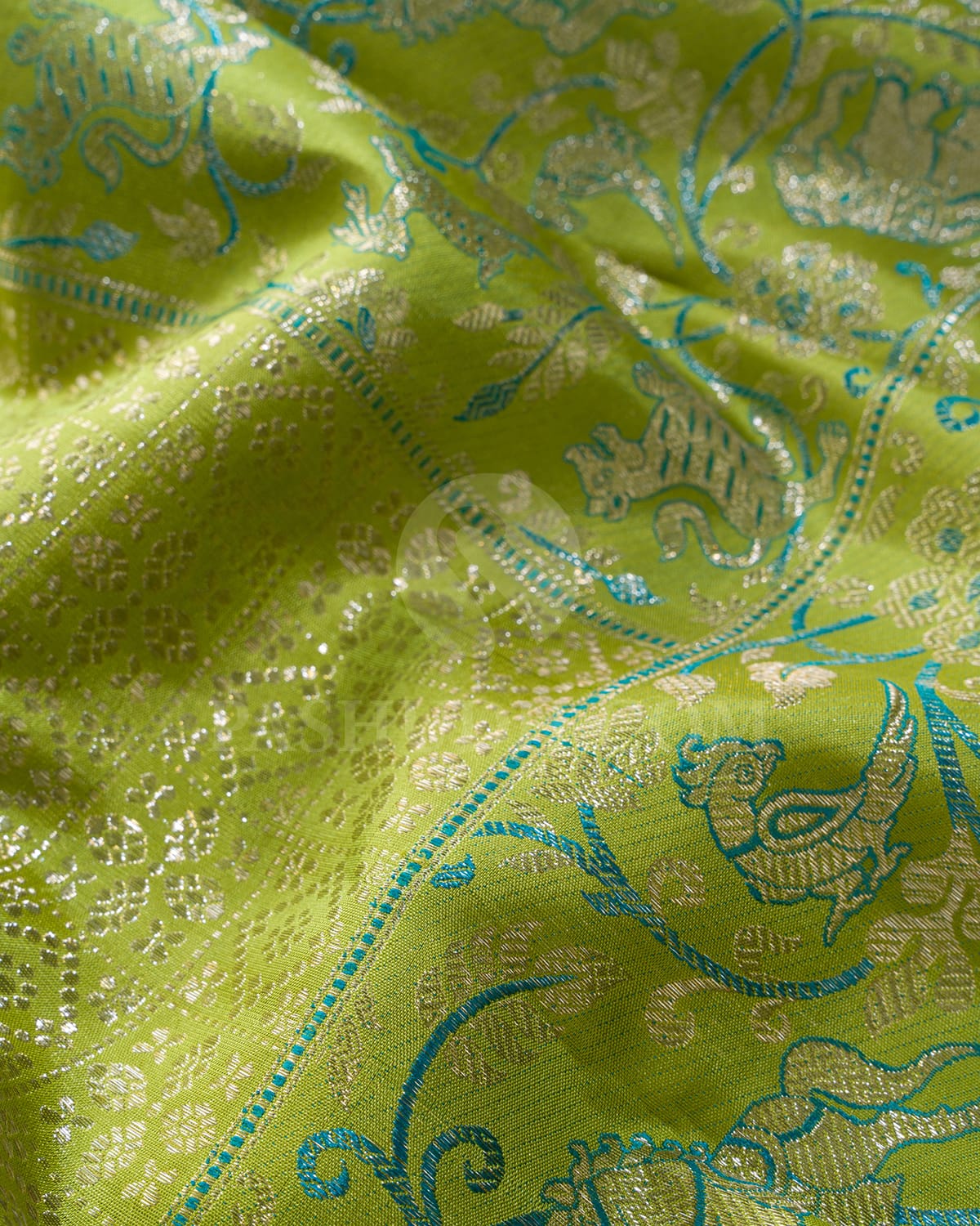 Product Code: S1503(G) Fabric : Pure Kanjivaram Silk Length: 5.5m Blouse – 80cm Weight (approx): 967 grams Wash Care: Dry Wash Delivery: 4-7 Business days Colors: Parrot Green