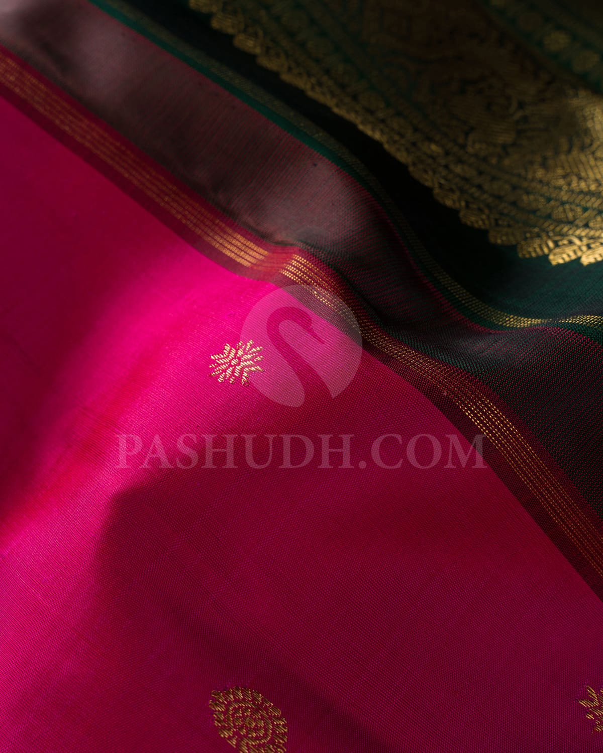 Vibrant and captivating, this rani pink Kanjivaram silk saree is a picture of timeless grace. The rich body gleams with lustrous silk sheen, beautifully framed by a thin gold zari temple border that adds a touch of subtle grandeur. Elegant and versatile, this saree perfectly blends tradition with understated sophistication. Its a graceful choice for any special occasion.