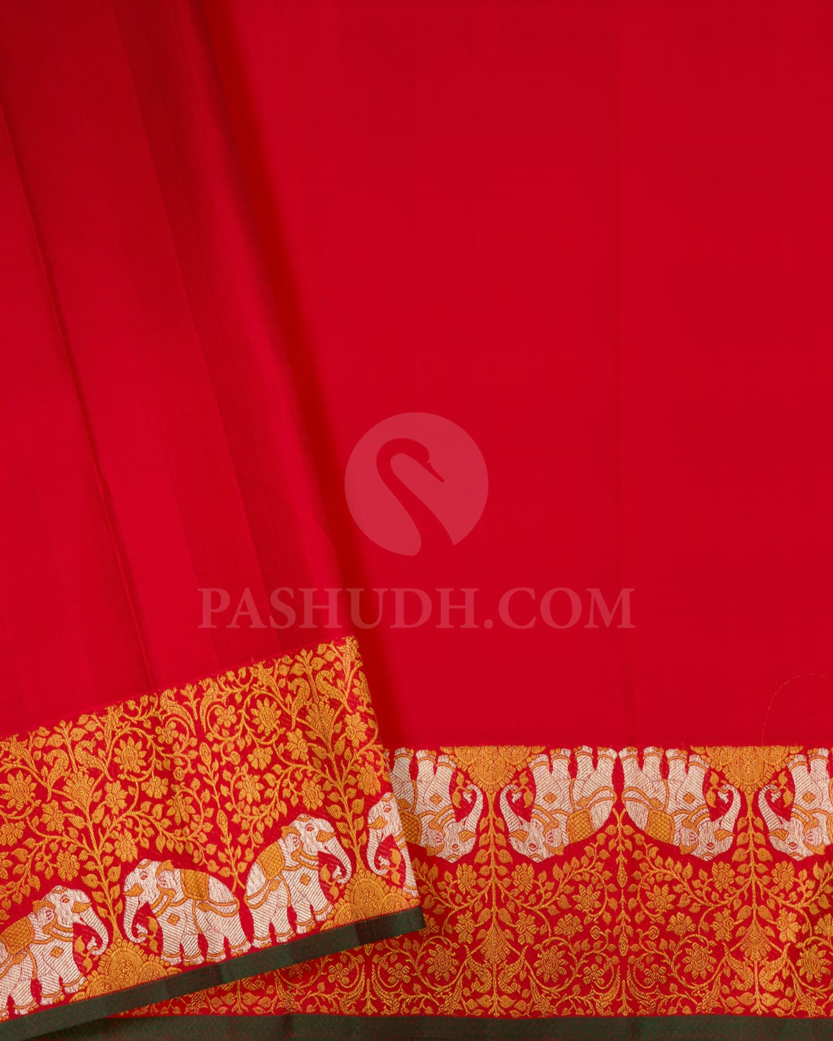 Step into royal grandeur with this majestic red Kanjivaram silk saree, featuring a self colored gold zari brocade body adorned with intricate floral jaals. The opulent border showcases beautifully woven elephants, adding a traditional and regal touch perfect for bridal celebrations. Each motif shimmers with exquisite craftsmanship, enhancing the saree’s luxurious appeal. A timeless and elegant drape, it is ideal for weddings and festive occasions where heritage meets splendor. This saree truly embodies the perfect fusion of tradition, artistry, and regal charm.