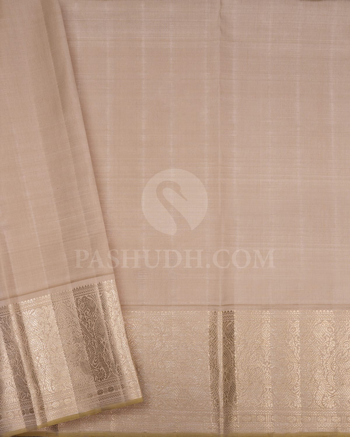 An ethreal choice for joyous celebrations, this Stunning Kanjivaram Silk Saree from the looms of Pashudh is a delight. Exquisite patterned stripes woven with silver gold zari decorate the beautiful violet body. A gorgeous pattern featuring various beings from the animal kingdom like mayil, kili, yaanai, etc. adorn the contrasting off white border with matching selvedge. An array of classic kuyil kanns embellish the rich beige pallu, making it an effortless head turner.