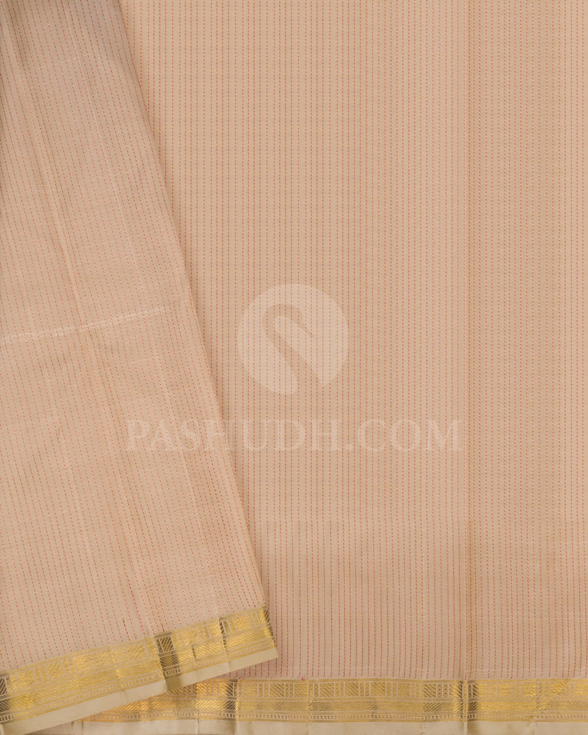 A delicate blend of grace and artistry, this Mauve Pink semi-transparent Kanjivaram Silk Saree captivates with its subtle sheen and ethereal drape. The body is adorned with exquisite gold zari meenakari buttas, adding refined detail to its soft texture. Completing the look is a thin cream gold zari border, lending just the right touch of sophistication and traditional charm. A perfect choice for those who adore understated elegance with a luxurious finish.