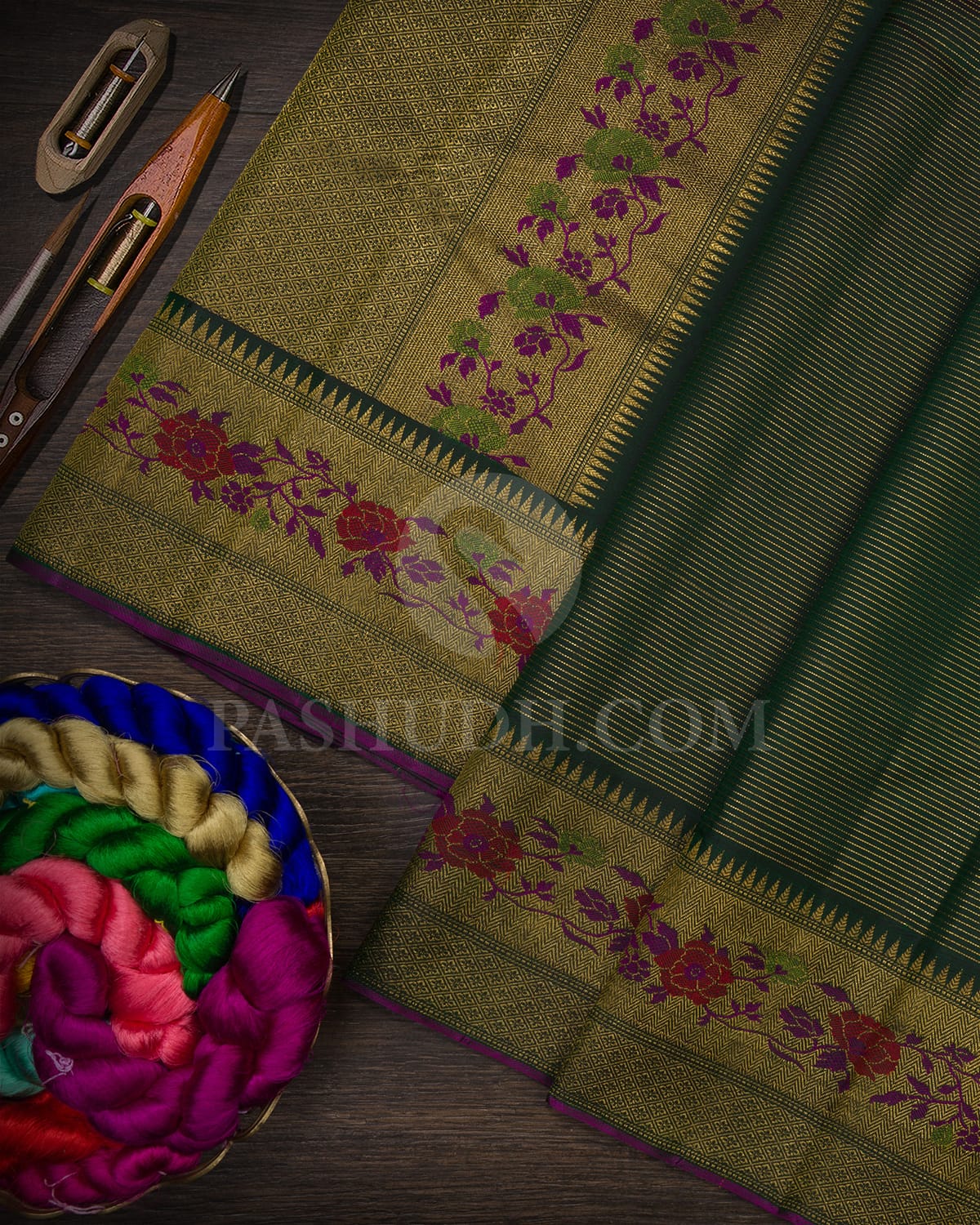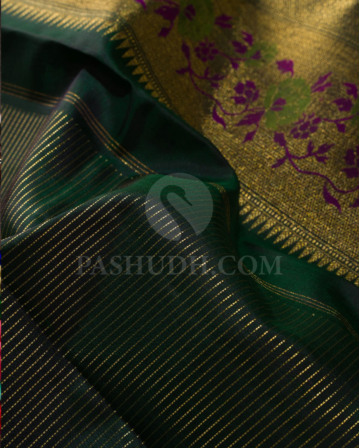 Make a striking statement in this forest green saree, featuring a body adorned with elegant gold zari stripes that add a touch of shimmer and sophistication. The self-colored border is decorated with delicate floral jaal patterns, creating a harmonious and graceful look. Perfect for festive occasions and traditional celebrations, this saree combines classic charm with refined elegance.