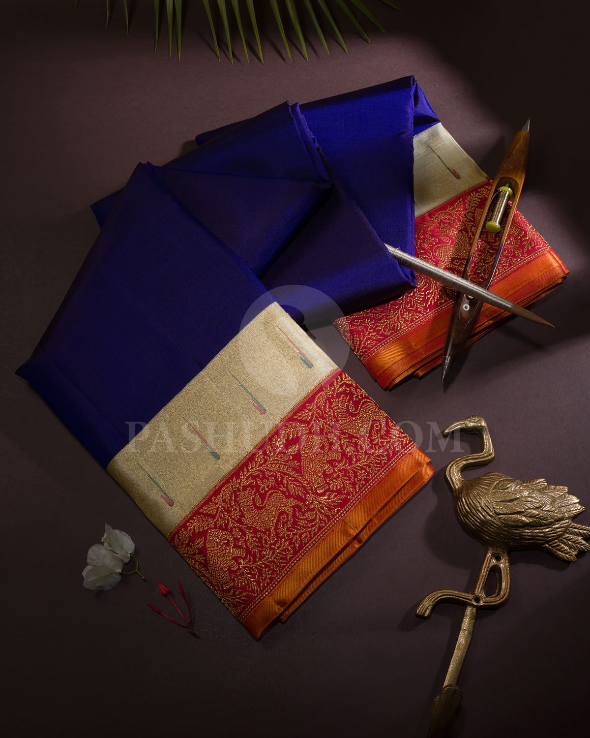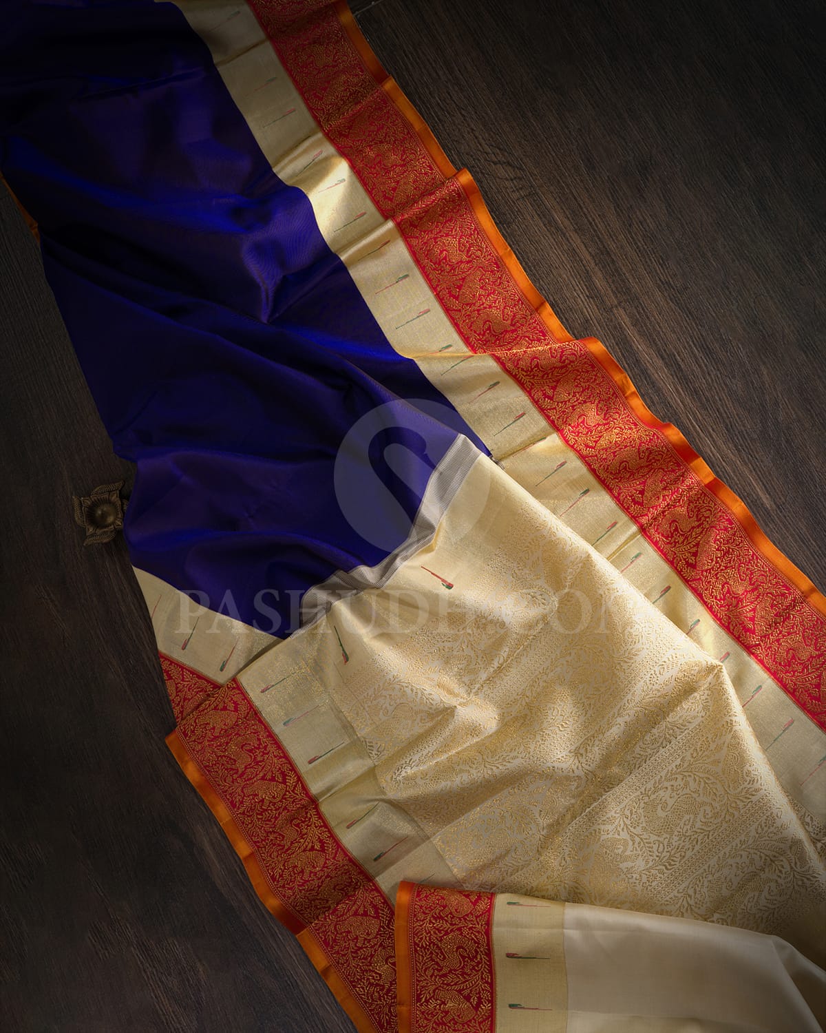 Step into the world of timeless elegance with this stunning saree that beautifully blends royal blue and vibrant red hues. The plain royal blue body radiates a deep, regal charm, enhanced with delicate gold and silver zari outlining that lends a subtle shimmer. Inspired by traditional artistry, an exquisite Paithani design woven in rich gold zari elevates its majestic appeal. The striking red border adorned with bold elephant and graceful yazhi motifs adds power and grandeur to the weave. Perfect for festive celebrations and cultural occasions, this saree is a true statement of heritage and sophistication.