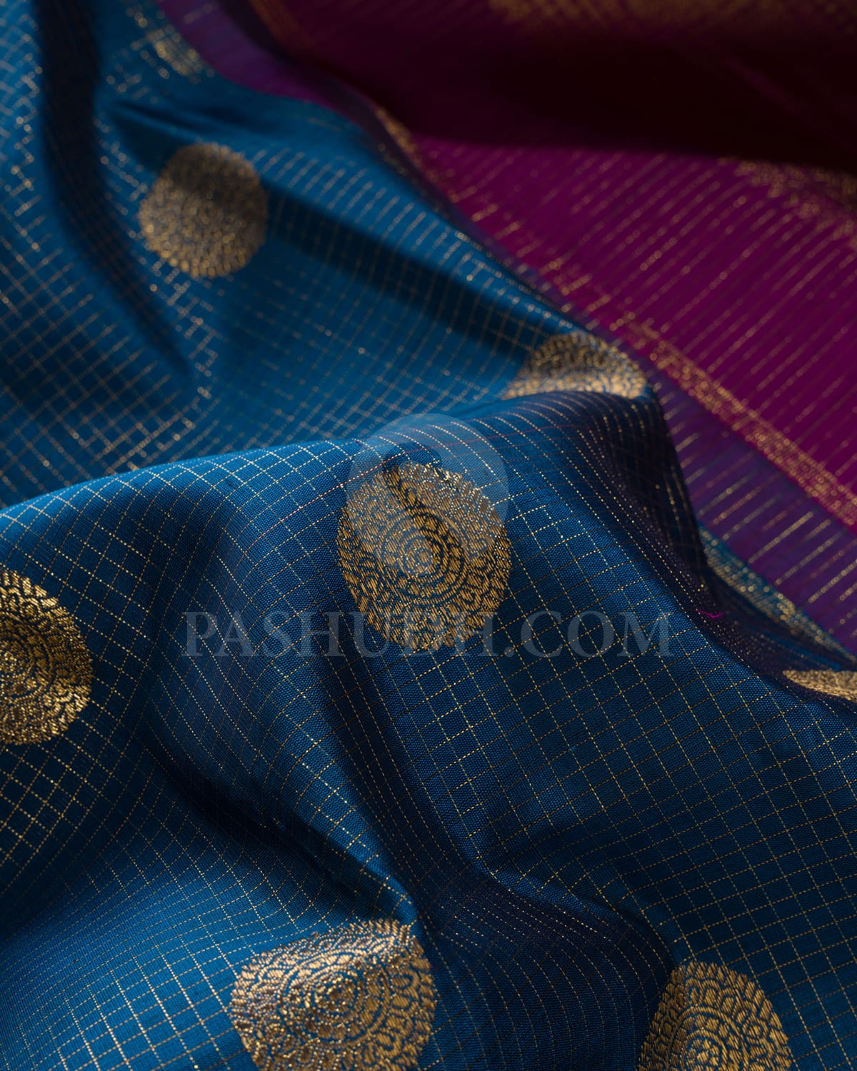 Striking and sophisticated, this cobalt blue Kanjivaram silk saree features exquisite gold zari vairaoosi checks adorned with bold rudhraksh buttas, creating a captivating interplay of tradition and grandeur. The rich magenta pallu and blouse add a vibrant contrast, making this drape a true head-turner for festive and celebratory occasions.