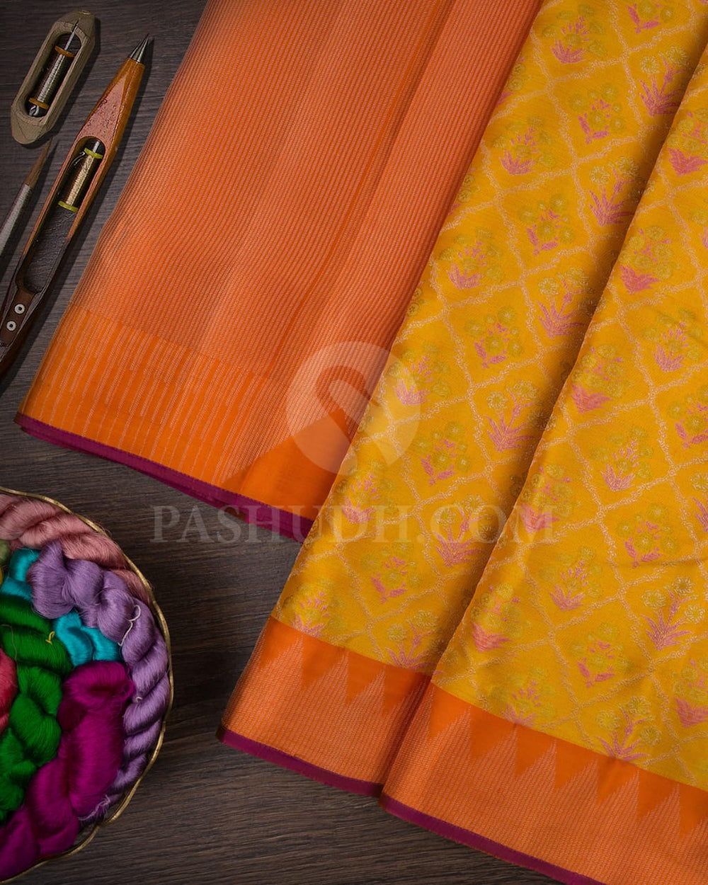 Mustard Yellow With Bright Tangerine Orange Kanjivaram Silk Saree-DJ366(A)
