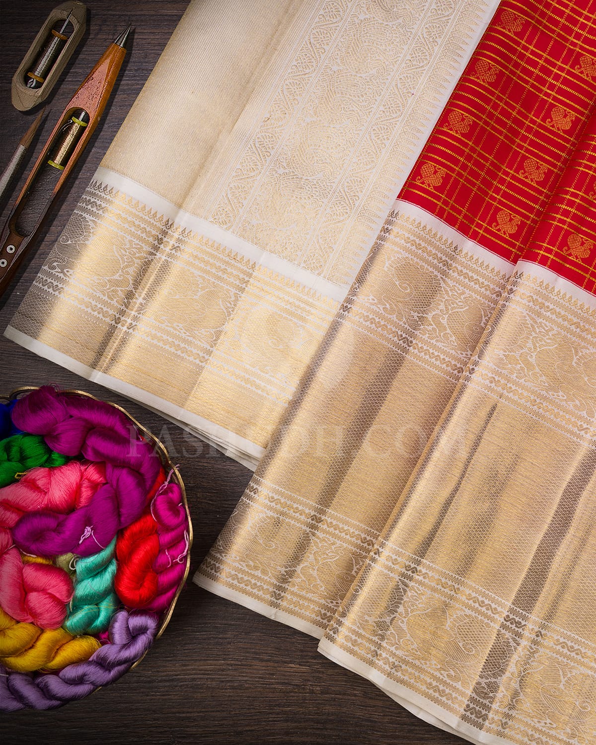 A magnificent blend of tradition and grandeur, this exquisite saree features a rich red body adorned with timeless check patterns. The charm is beautifully heightened by a broad ivory border intricately woven with zari, creating a perfect harmony of bold elegance and bridal grace. A true celebration of heritage, crafted to make every occasion unforgettable.