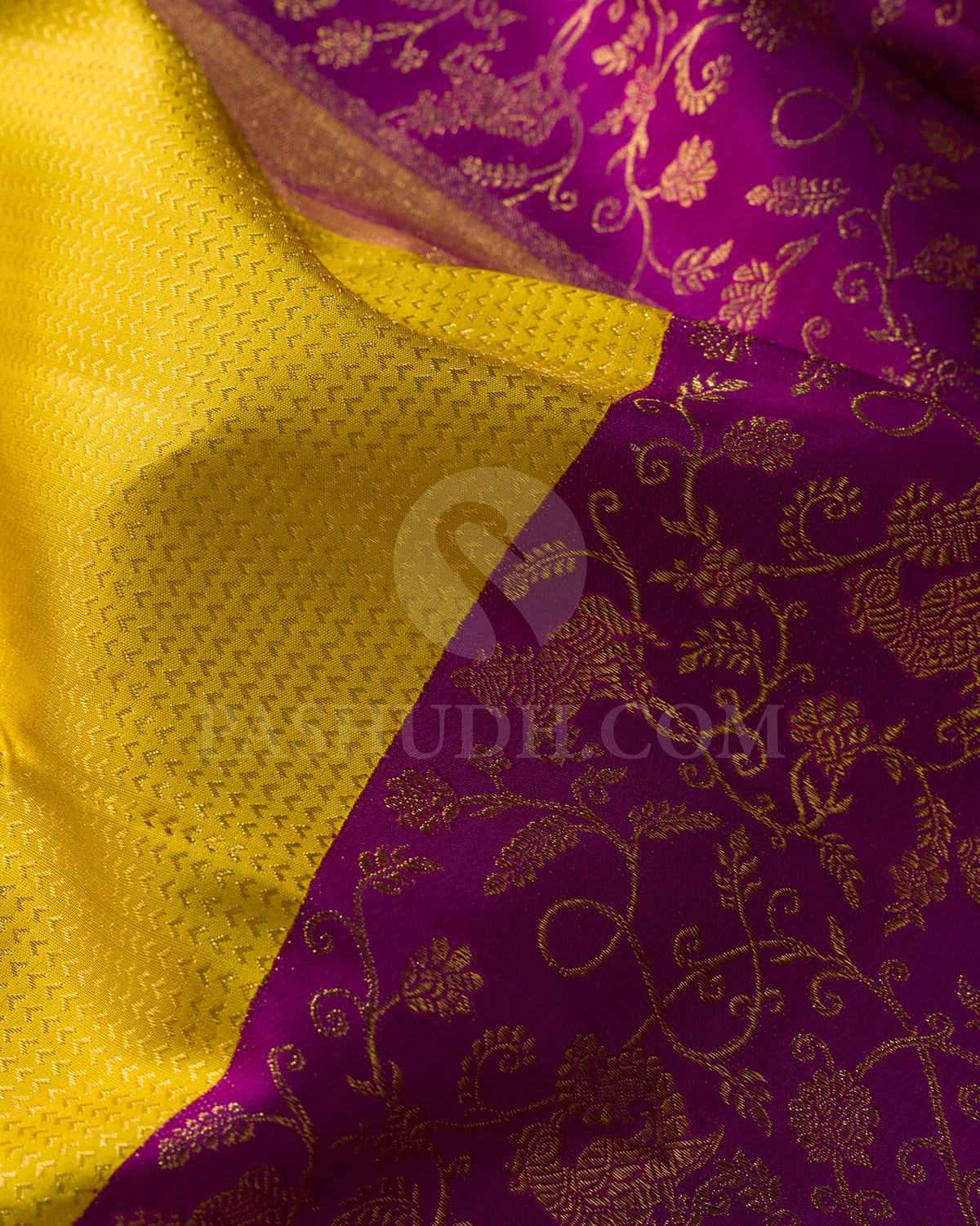 Product Code: S1631(A) Fabric : Pure Kanjivaram Silk Length: 5.5m Blouse – 80cm Weight (approx): 944 grams Wash Care: Dry Wash Delivery: 4-7 Business days Colors: Yellow and Purple
