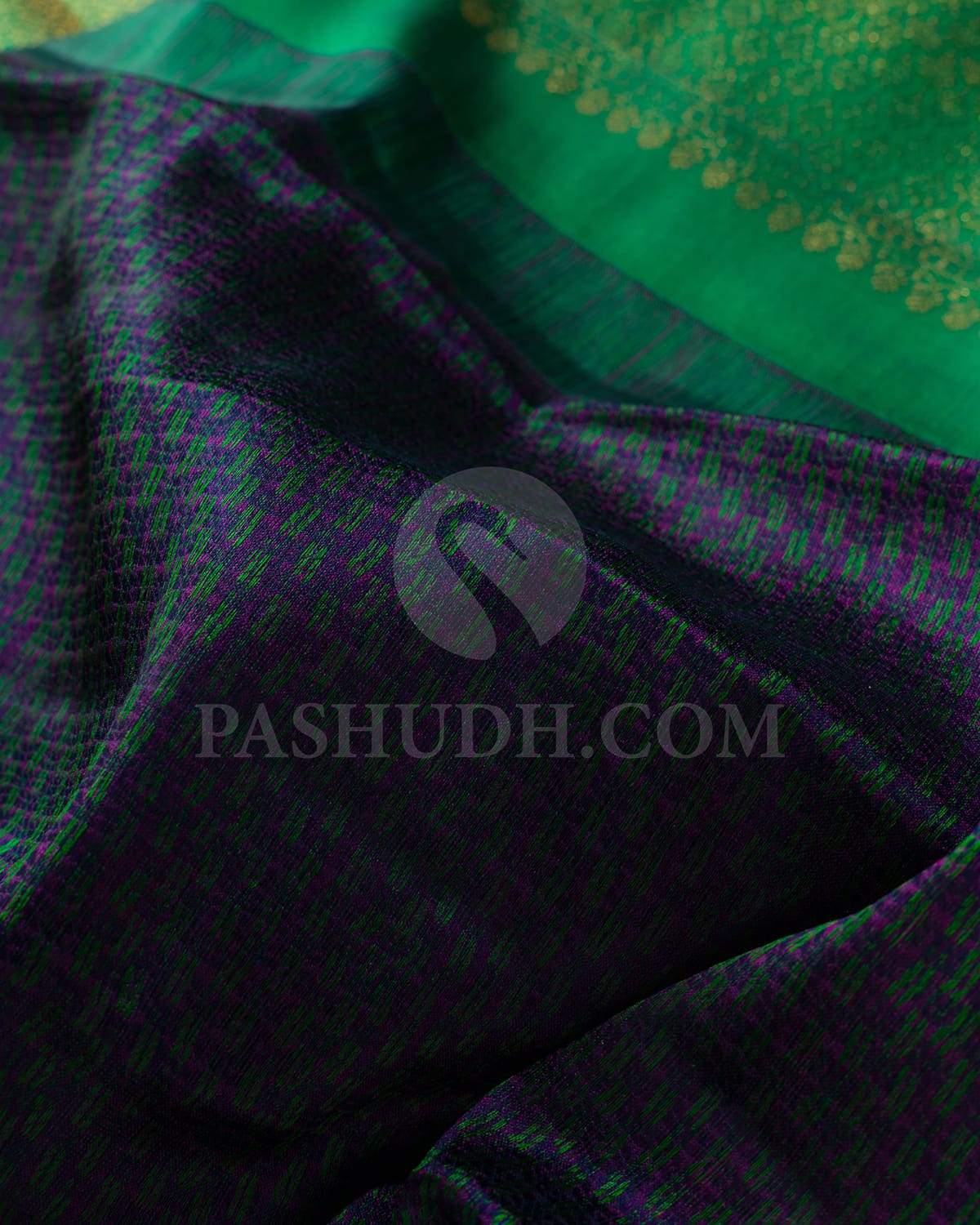 A striking saree featuring an emerald green, pink, and royal blue body with an embossed thread-like check pattern that adds depth and texture. The intricate detailing lends a rich, contemporary appeal while maintaining traditional charm. Finished with a subtle thin green border, this saree is perfect for elegant festive and special occasions.
