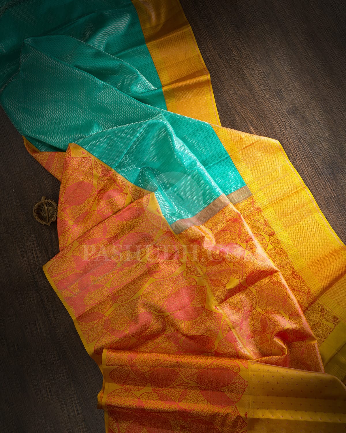 Striking and regal, this saree features a rich aqua blue body enhanced with spaced chevron patterns woven in silver zari, complemented by a soft mango yellow shimmer that adds a radiant, refined glow. The border stands out with a large, intricate leaf motif, beautifully crafted in silver zari to create depth and elegance. Rich in color and fine craftsmanship, this saree is perfect for grand occasions and festive celebrations, making a sophisticated statement of timeless style.