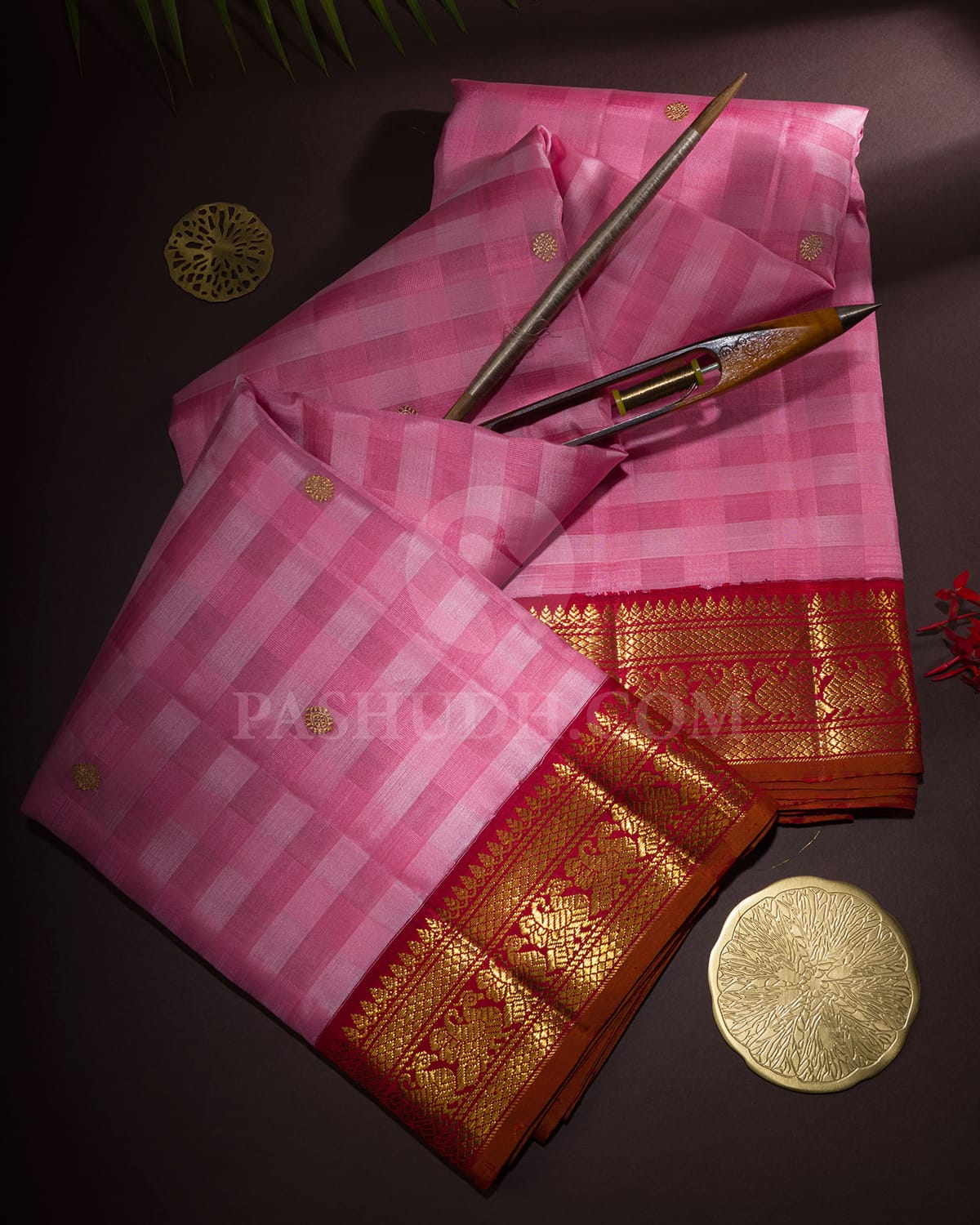 Baby Pink And Red Kora Kanjivaram Silk Saree-S1609(B)