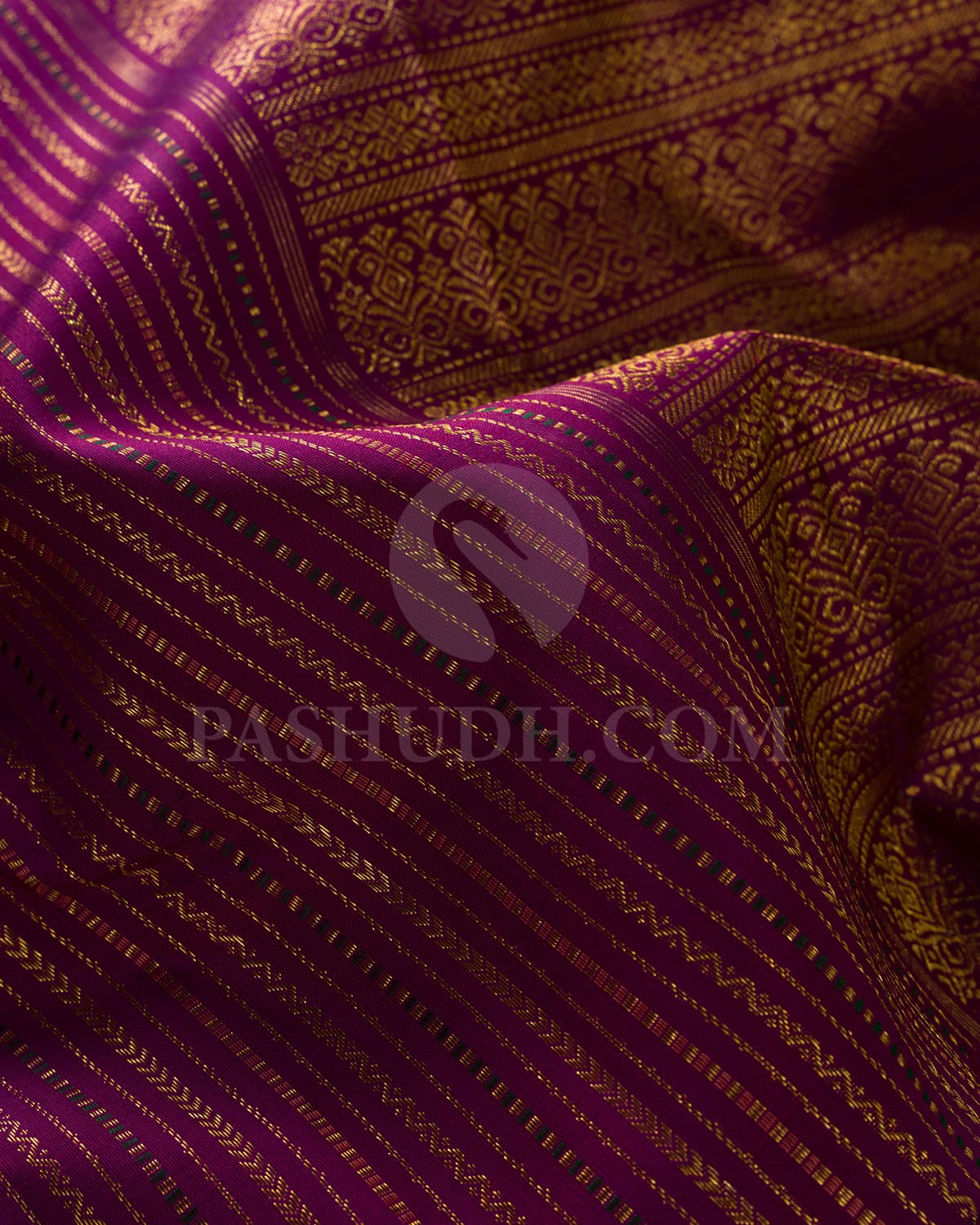 Steeped in tradition, this Magenta self-colored Kanjivaram silk saree showcases understated sophistication and classic charm. The body features graceful vertical patterns in lustrous gold zari, adding subtle shimmer and elegance. Perfect for weddings, festive gatherings, and special occasions, this saree radiates timeless beauty and refined style.