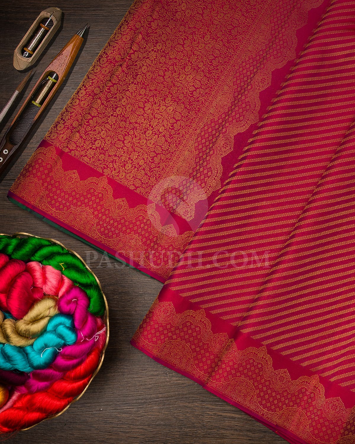 A stunning red and shot purple dual shaded bridal saree featuring delicate diagonal gold zari lines across the body, adding depth and shimmer. The border is richly adorned with intricate gold zari jewelry inspired motifs, enhancing its regal appeal. Complemented by a bottle green pallu and blouse, this saree exudes grandeur and elegance, making it a perfect choice for a bride seeking timeless sophistication.