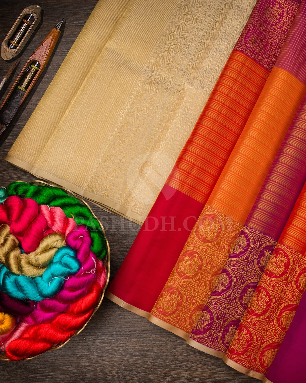 Product Code: S1642(A) Fabric : Pure Kanjivaram Silk Length: 5.5m Blouse – 80cm Weight (approx): 793 grams Wash Care: Dry Wash Delivery: 4-7 Business days Colors: Purple,Orange and Beige
