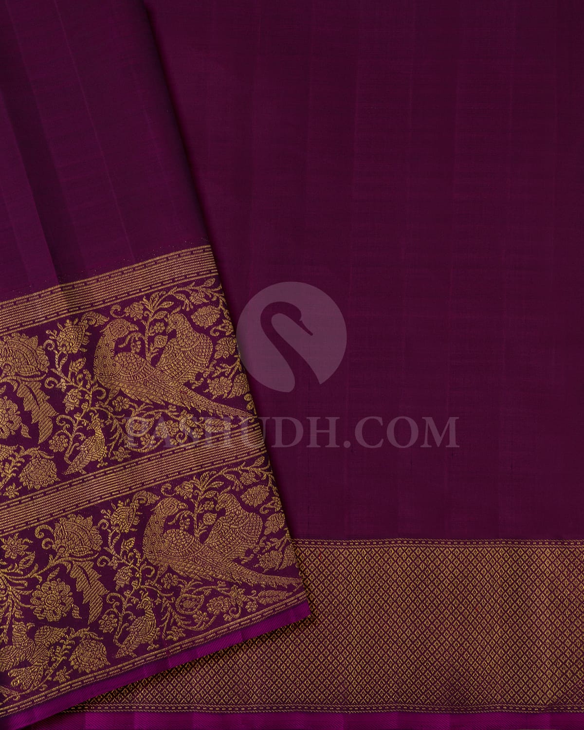 Make a striking statement with this elegant grey saree, featuring a body adorned with self-colored embosses and delicate gold zari tiny buttas that shimmer with subtle sophistication. The rich purple border, intricately woven with gold zari bird motifs and jaals, adds a regal and festive contrast. The refined grey paired with deep purple and shimmering zari creates a captivating and graceful appeal. Ideal for weddings, festive gatherings, and special occasions, this saree beautifully blends understated charm with timeless craftsmanship.