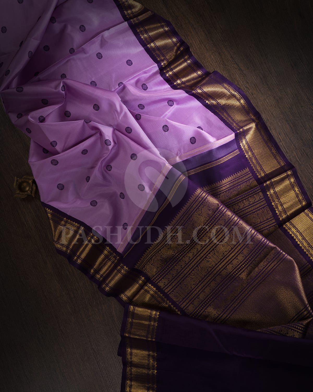 Bathed in soft sophistication, this lavishing lavender kanjivaram silk saree comes alive with deep purple and  buttas that dance gracefully across its body. The gold zari traditional border adds a touch of regal charm, perfectly highlighting its delicate artistry. A drape that blends elegance with tradition, leaving a lasting impression at every festive or grand occasion