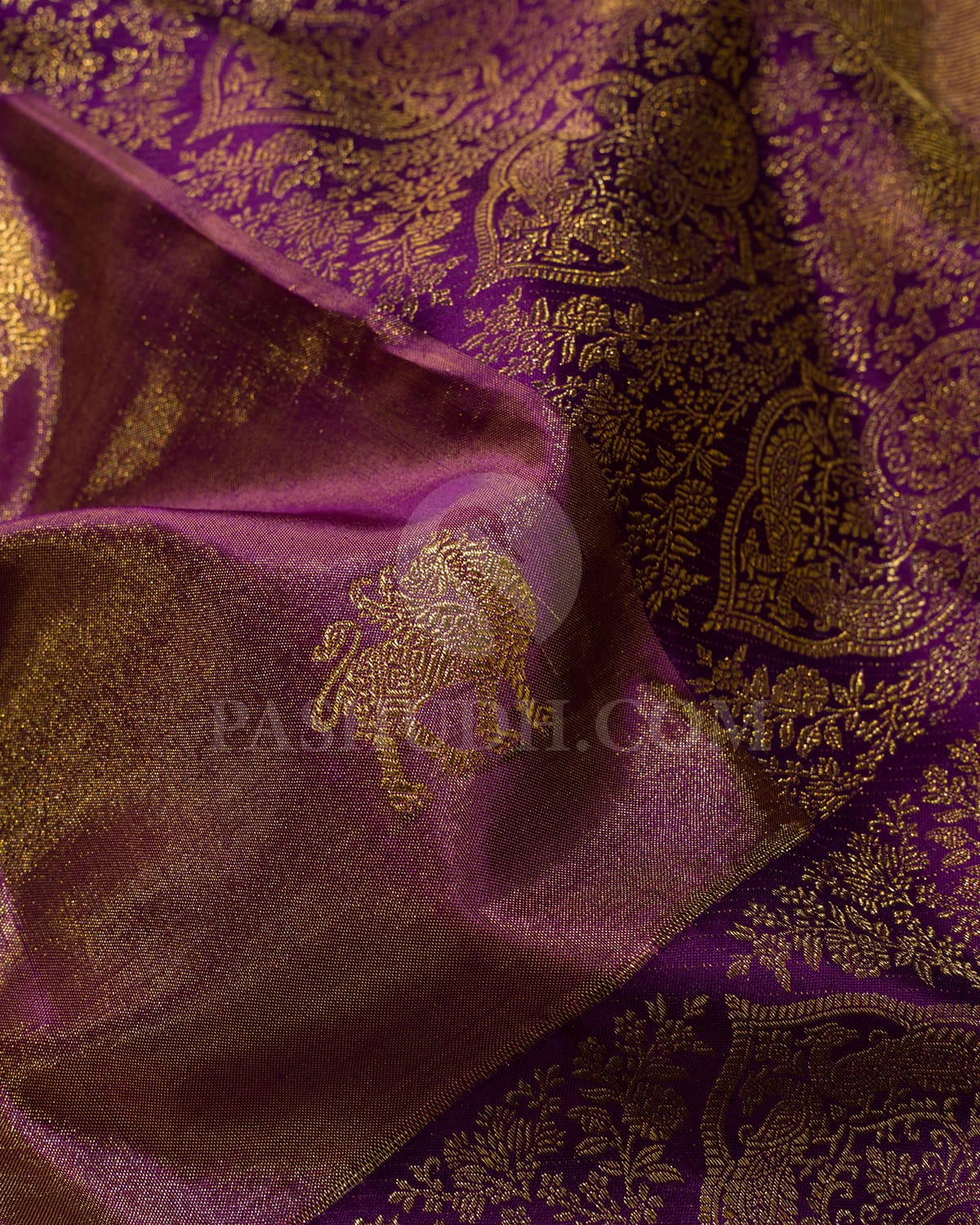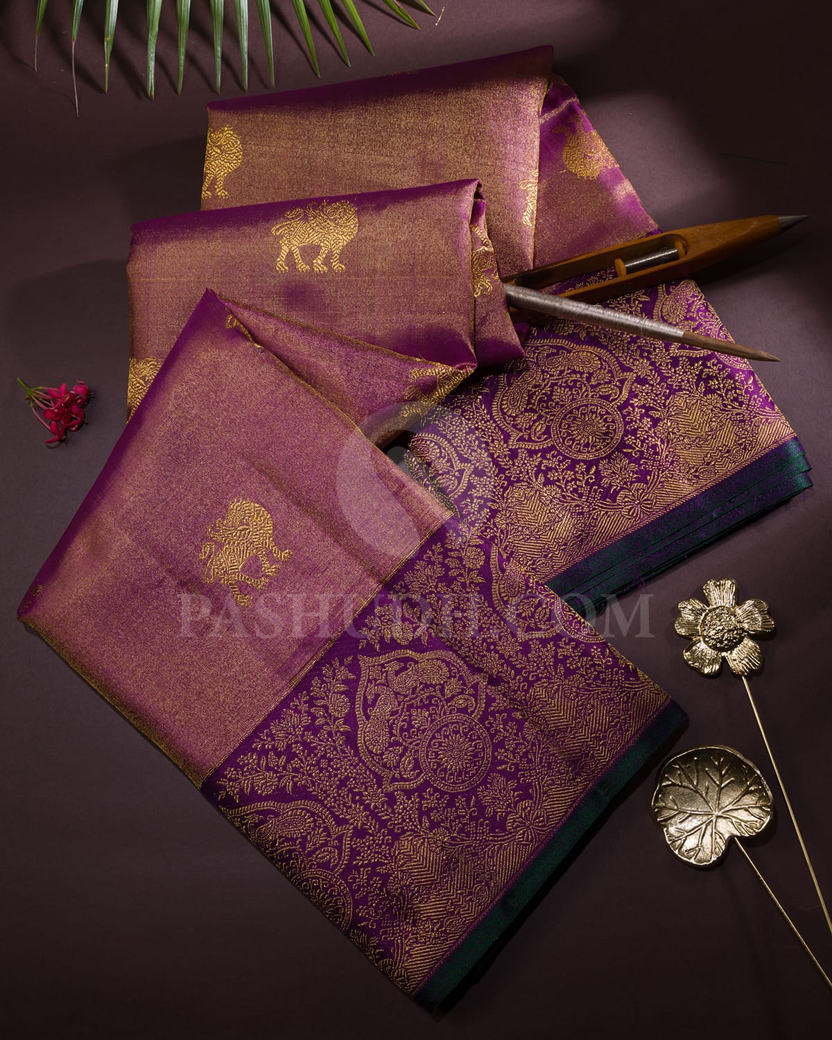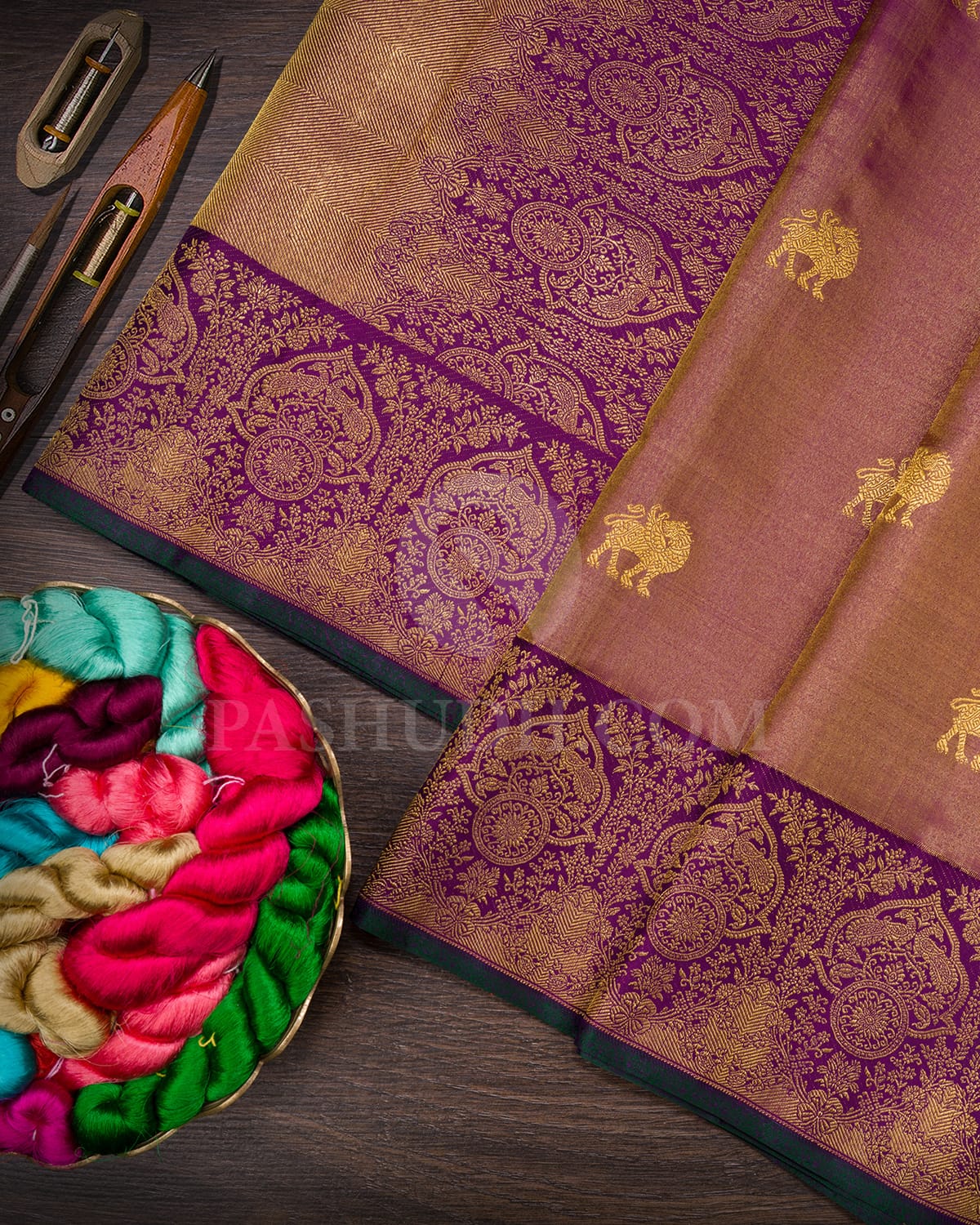 Step into a world of timeless elegance, this Kanjivaram silk saree features a delicate purple base shimmering with gold zari, adorned with intricate gold zari Yazhi buttas that exude regal charm. The purple border, enhanced with gold zari shimmer, provides a striking contrast, adding depth and grandeur. Perfect for weddings, festive occasions, and celebratory gatherings, this saree is a true celebration of craftsmanship, grace, and heritage.