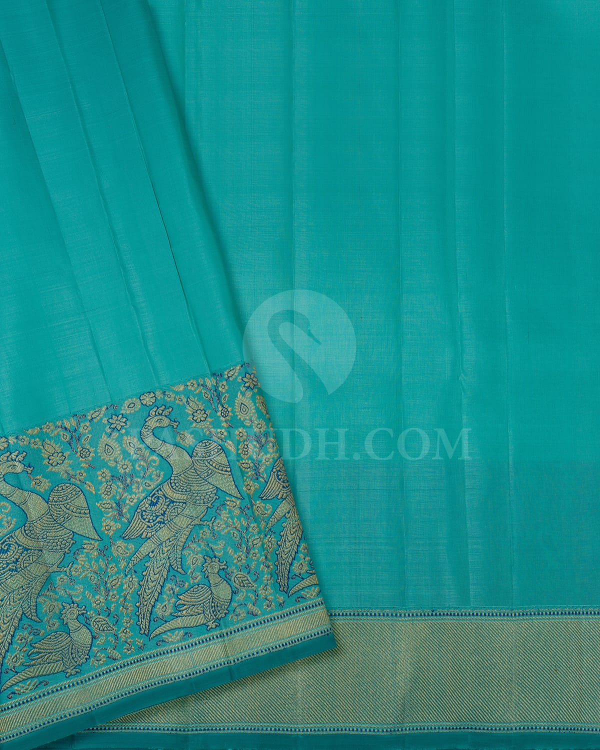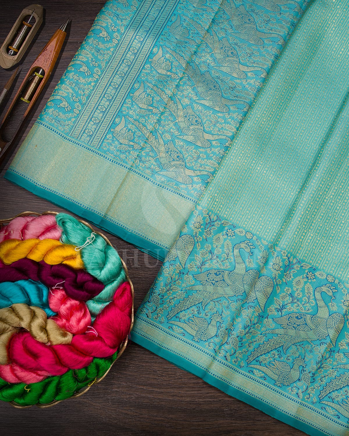A masterpiece of bridal grandeur, this sky blue Kanjivaram silk saree radiates elegance with its serene yet striking hue. The body gleams with closely packed gold zari geometric patterns, creating a rich and luminous texture. The border is adorned with unique gold zari bird motifs and graceful jaal designs, finely outlined in thread, adding depth and artistic charm. Perfect for weddings and festive occasions, this exquisite drape beautifully blends refined sophistication with timeless tradition.