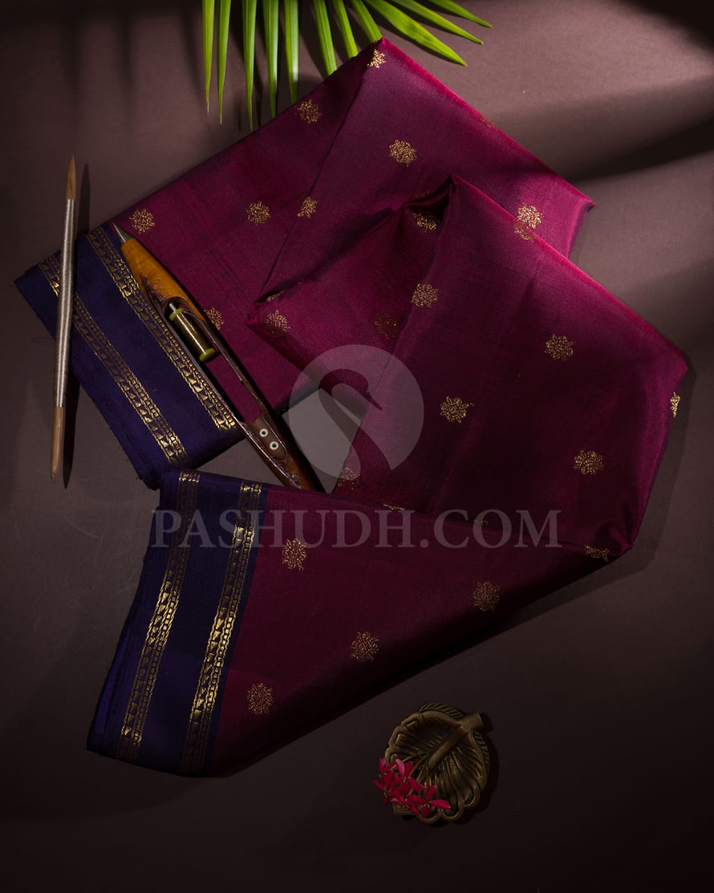 Rooted in elegance and woven with finesse at the looms of Pashudh, this deep maroon Kanjivaram saree speaks to the beauty of simplicity. The body is dotted with delicate gold zari buttas, while a rich navy blue contrast adds depth. Light in weight yet rich in tradition, it is ideal for refined, everyday occasions.