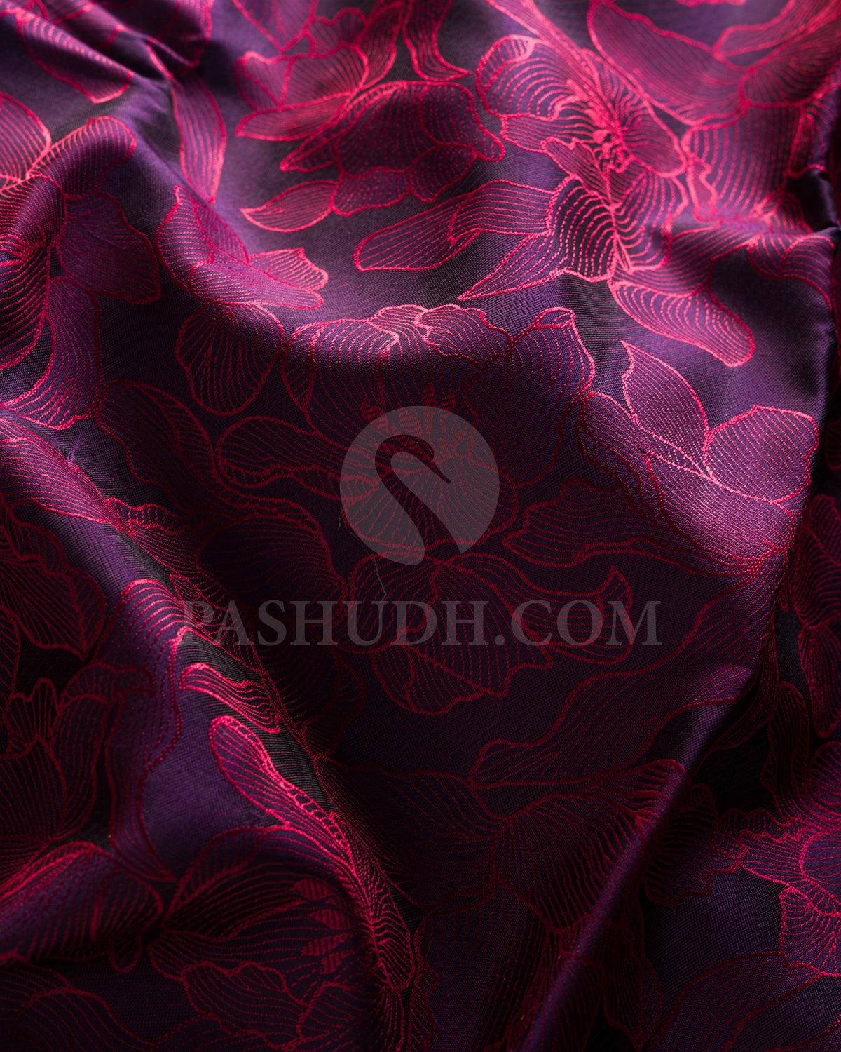 Look Beautiful in this Lovely Kanjivaram Silk Saree from Pashudh. Gorgeous abstract red florals decorate the stunning egg plant purple body, offering a stunning contrast. The matching egg plant purple border and pallu exude traditional grandeur featuring rich gold zari patterns and classic motifs. Paired with a plain egg plant purple silk blouse wtih matching border, this delightful weave is a wonderful evening wear.