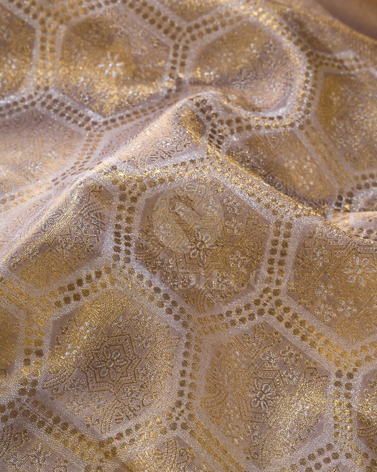 Ethereal and exquisite, this grey tissue Kanjivaram silk saree shimmers with understated grandeur. The body is adorned with unique floral and geometrical motifs outlined in gold and silver zari within elegant hexagon patterns, reflecting intricate craftsmanship. A broad gold zari border frames the drape with regal brilliance, making it a perfect pastel bridal masterpiece that radiates timeless elegance and subtle shimmer.