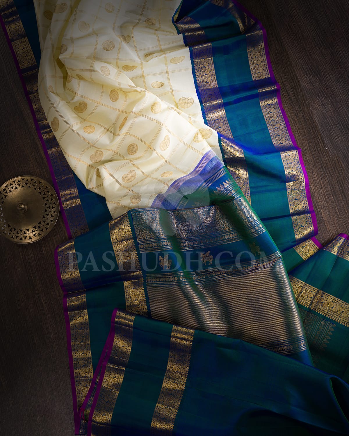 Ethereal in half white and peacock blue, this exquisite Kanjivaram saree is a vision of grace and tradition. The body gleams with gold zari mango and rudhraksh buttas woven in elegant checks, adding a touch of heritage charm. Its striking retta petta border enhances the drape with a regal contrast. A true head-turner that beautifully blends purity and opulence.